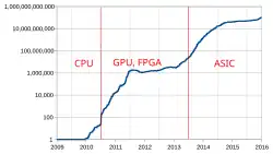 В первых версиях программы-клиента была кнопка «сгенерировать новые биткойны»[35]. Для поиска хеша заголовка нового блока использовался центральный процессор компьютера. Вероятность успешного создания блока майнером приблизительно равна отношению его вычислительной мощности к вычислительной мощности всей сети, и если это отношение очень мало, то вероятность получения награды даже за длительный промежуток времени будет незначительной. Желающие увеличить вероятность получения вознаграждения стремятся задействовать как можно большие вычислительные мощности. Особенность задачи перебора хешей позволяла применить максимальное распараллеливание вычислений. Для этого хорошо подошли многопоточные графические процессоры (GPU) после появления небольшой дополнительной программы[64] (в сотни раз производительнее CPU[65]) и платы с FPGA (производительность аналогична видеокартам, но превосходят их по энергоэффективности). После этого майнинг при помощи центрального процессора оказался нецелесообразным из-за слишком малой вероятности получить вознаграждение, и кнопку в программе-клиенте убрали. Позднее были выпущены специализированные процессоры (ASIC), ориентированные на вычисление хешей для сети «Биткойн», ещё более производительные, чем GPU и FPGA. С 2013 года майнинг без специализированных процессоров (на видеокартах или центральном процессоре) стал нерентабельным: стоимость потребляемой электроэнергии превысила средний результат[66][67].