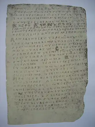 Судя по почерку, было два автора. Один из них был основным, а второй написал всего четыре строки на третьей странице и еще четыре на четвертой[2]. Письмо основного автора уставное, грубое и архаичное, похожее на письмо Добромировского Евангелия. Второй почерк изящнее, плотнее и с более длинными буквами[3].