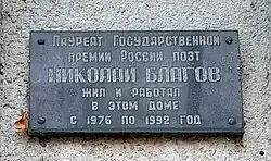 Мемориальная табличка Н. Благову.На стене дома с квартирой Благовых в Ульяновске (улица Матросова, 5), 19 августа 1994 года установлена мемориальная табличка, с текстом: «Дом, в котором с 1976 по 1992 жил и работал поэт Николай Благов»[1].