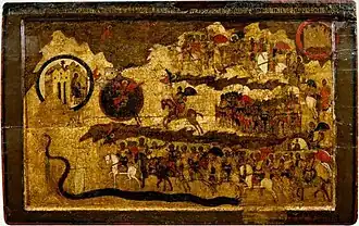 От горящего города движется многофигурная процессия конных и пеших воинов, направляющихся к Небесному Иерусалиму, изображённому в левой части иконы. Он помещён на горе в сени красного шатра и заключён в мандорлу из красных и зелёных кругов, разомкнутую в одном месте; к этому месту ведёт дорога, по которой воинам предстоит войти в Небесный Иерусалим. Этот небесный град трактуют как образ Москвы[6]:185. В нём воинов встречает Богородица с Младенцем Иисусом, сидящим у неё на коленях. Богомладенец раздаёт ангелам мученические венцы для воинов. У Небесного Иерусалима произрастает райский сад. Деревья в нём имеют красные плоды, а на деревьях вне райского круга плодов нет, и они, хотя и растут по берегам райской реки, относятся уже к земному пейзажу.