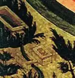 Из Небесного Иерусалима вытекает райская река. Она обладает сложным символизмом: у Павла Муратова это библейская «чистая река воды жизни» (Откр. 22:1)[10]:11, у В. И. Антоновой источник воды — ясли Христовы в Первом Риме, а иссякший источник — Византия, не сумевшая сохранить веру и завоёванная турками[5]:133. В. В. Морозов указывает, что если река вытекает из яслей Христовых, то тогда два небольших источника, стоящих рядом с ними, можно понимать как Православную (источник, через который протекла река) и Католическую (иссякший источник) церкви[13]:22. Тогда широкая река, текущая навстречу воинам, это символ истинной веры, ревнителями которой выступают российские правители.