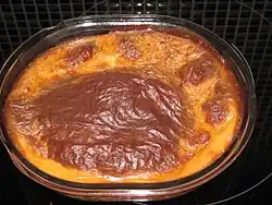 | Пудинг из хлеба с маслом[К. 40] (Bread and butter pudding), устар.: Whitepot — «Белый горшочек» | ![]() | Международное (первый известный рецепт в Британии — XVIII в.) | Запечённый в духовке или горшочке пудинг, относящийся к т. н. «хлебным пудингам». | Слои ломтиков хлеба (намазаны маслом, добавлен изюм) заливают заварным кремом (приправлен мускатным орехом, ванилью или др. специями); запекают. | Как десерт. |