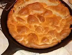 | Йоркширский пудинг[К. 4] (Yorkshire pudding) устар. Дриппинг пудинг (Dripping pudding) «Капающий пудинг» | ![]() | Сев. Англия сер. XVIII в. (с 2007 г. день этого блюда — 1-е воскресенье февраля) | Пудинг, выпеченный в большой, но не глубокой форме, иногда в маленьких круглых формочках. | Кляр (яйцо, мука и молоко), раньше ставили под вращающийся на огне вертел с мясом, жир с которого капал на пудинг. | Как гарнир (напр., с горячим ростбифом), с начинкой как блюдо (напр., с колбасками — «тойд-ин-зе-хол»; часто на «Воскресный обед». |