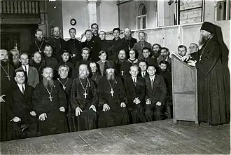 Богословский факультет помещается в здании Епархиального совета (бывш[ий] храм), и занятия производятся только вечером. Число студентов на всех 4-х курсах — 41 чел[овек], из которых — 10 девиц; профессоров, доцентов и лекторов — 10 чел[овек], из которых — 6 духовных лиц. Деканом Богословского факультета состоит прот[оиерей] Виктор Гурьев. За период своего существования факультет произвёл лишь 4 выпуска студентов, получивших звание кандидатов богословия; всего за это время окончило 13 чел[овек], из которых большая часть в настоящее время состоит священнослужителями в г. Харбине. При моем посещении Богословского факультета меня приветливо встретили профессора и студенты, знакомили с постановкой учебного дела, причем некоторые студенты просили меня передать Вашему Святейшеству их желание перейти в Московский богословский институт и просьбу исходатайствовать у Советского Правительства разрешение перевезти с собой в Москву имеющуюся у них богословскую литературу, а также — льготный удешевленный проезд по железной дороге до Москвы. <…> Богословский факультет общежития не имеет.