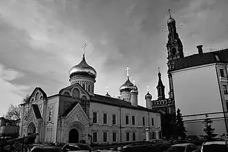 Нижний мощный двухэтажный четверик расположился вдоль улицы в виде прямоугольных, также двухэтажных объёмов-крыльев, завершаемых сквозными гранёными башенками над шатровыми покрытиями и с лепестковыми главками. Над восточным и западным ризалитами четверика располагались башенки с пятью крестами (частично утрачены)[11].