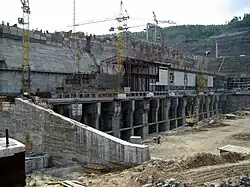 Работы подготовительного этапа строительства Богучанской ГЭС были начаты в октябре 1974 года, когда на площадку строительства прибыл первый десант «БратскГЭСстроя», завершавшего строительство Усть-Илимской ГЭС[59]. Управление строительства Богучанской ГЭС было создано 10 мая 1976 года. В ходе подготовительного этапа велось строительство подъездной автодороги Седаново — Богучанская ГЭС, линий электропередачи, города гидростроителей Кодинска (с 1977 года), промышленной базы. В 1980 году было начато строительство основных сооружений Богучанской ГЭС — 18 июня 1980 года из котлована первой очереди был извлечён первый кубометр грунта, первый кубометр бетона в тело плотины уложили 17 апреля 1982 года, 100-тысячный кубометр бетона был уложен в 1984 году. 25 октября 1987 года на строительстве Богучанской ГЭС было произведено перекрытие Ангары, сток реки переведён на 5 временных отверстий водосбросной плотины; для пропуска судов и плотов с лесом был оборудован временный шлюз. В ходе строительства был изменён проект ГЭС — в частности, было решено увеличить её мощность до 4000 МВт с целью повышения выработки «пиковой» электроэнергии. Работами по лесосводке и лесоочистке зоны затопления, а также по переносу населённых пунктов в 1980-е годы занималось МВД СССР силами заключённых. При этом было сведено около 10 млн м³ товарного леса[60][59]. По причине недостаточного финансирования срок пуска Богучанской ГЭС неоднократно переносился Минэнерго СССР: в 1987 году — на 1993 год; в 1988 году — на 1994 год; в 1989 году — на 1995 год.