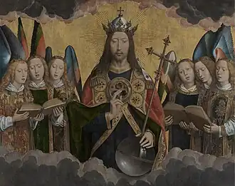 Вплоть до недавнего времени большинство исследователей видели в центральной фигуре Иисуса Христа[127][48][40][2] (иконографический тип «Спаситель мира»[2][128][19]); как Христос он описывался и в изданиях Королевского музея[8]. Альфонс-Жюль Ваутерс писал, что созданный Мемлингом образ словно бы иллюстрирует слова Евангелия: «…увидят Сына Человеческого, грядущего на облаках небесных с силою и славою великою» (Матф. 24:30); «…приидет Сын Человеческий во славе Отца Своего с Ангелами Своими» (Матф. 16:27)[127].