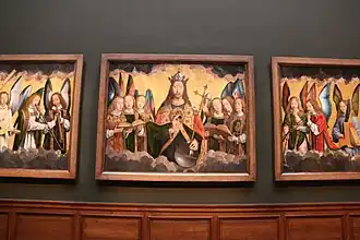 Левая панель (инвентарный номер 779) имеет размеры 170 × 231,5 см[46][113] (по другим источникам 165 × 230 см[2][163]); на сайте музея она указана под названием «Музицирующие ангелы»[163]. Композиция боковых панелей отличается симметричностью и простотой: на обеих изображены ангелы с музыкальными инструментами, расположенные в ряд группами по пять. В то же время боковые панели образуют единое целое с центральной: фигуры ангелов-музыкантов изображены на том же золотом фоне и в обрамлении тех же голубовато-дымчатых облаков, по краям подсвеченных бледно-розовым[164]. Исследователи неоднократно отмечали нехарактерность золотого фона для живописи Мемлинга; предполагалось, что использование им золота могло быть уступкой испанским вкусам[111]. Польский историк искусства Антоний Земба считал, что золотой фон как художественное решение был обусловлен особенностями пространства: вначале алтарь воспринимался вошедшим в храм зрителем с большого расстояния, в дальнем конце образованной пятью пролётами перспективы, и нужно было, чтобы фигуры Бога и ангелов отчётливо выделялись и легко различались глазом[124].