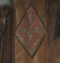 Следующий, четвёртый инструмент — одна из трёх труб (две другие изображены на правой панели). Все три имеют разную форму; общего у них то, что все они, судя по всему, изготовлены из потемневшего от времени серебра и все имеют мундштук[193][194]. Труба на левой панели — одна из двух изогнутой формы; исследователи задаются вопросом, представляют ли они собой так называемую трубу с кулисой, однако, хотя эта разновидность трубы в XV веке уже существовала, ничто явным образом не указывает на то, что изображённые в триптихе инструменты имеют выдвижной элемент[194]. В то же время её соседство с шалмеем (№ 5) позволяет предположить, что оба инструмента составляют дуэт: своего рода «урезанную» версию духового ансамбля, в которых наряду с шалмеями использовались именно трубы с кулисой[195][К 15].