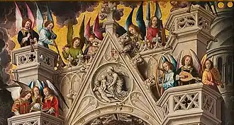 С обеих сторон Спасителя окружает по трое ангелов, держащих в руках толстые книги — вероятно, сборники гимнов или псалтыри[145][157][155]. Альфонс-Жюль Ваутерс отмечает их сходство с ангельской группой, изображённой на другой, более ранней работе Мемлинга: триптихе «Страшный суд» (ок. 1467—1471). Воспевающие хвалу Господу ангелы исполнены кротости, их ниспадающие локоны увенчаны золотыми обручами, за спиной у них разноцветные крылья[145]. Лики ангелов созерцательно-безмятежны; в них нет экспрессии, присущей образам Гентского алтаря[158][9]. Одежды их, как и одежды Христа, напоминают литургические одеяния, богато украшенные и расшитые золотом[145][К 13]. Морис Макнами (Maurice B. McNamee) идентифицирует их как облачение диаконов и субдиаконов — альбы, далматики, амикты и манипулы (на левых руках)[146]. На далматике крайнего слева ангела читаются буквы HS, RIA (в верхней части) и MAR (внизу) — несомненно, части монограммы IHS (от первых букв греческого написания имени Иисус) и имени Мария[160][155]. Кроме того, в отделке ангельских одеяний присутствуют гербы Кастилии, провинции Леон и королевства Нахеры (см. раздел «Сведения о заказчике»), а среди разнообразных узоров, украшающих далматику крайнего справа ангела, присутствует изображение орла с распростёртыми крыльями[161].