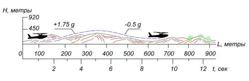 Типичный профиль полёта боевого вертолёта с огибанием рельефа местности по высоте.