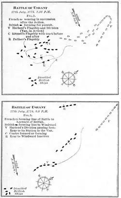 Утром 27 июля 1778 при ветре от SW, флота находились в 6—10 милях друг от друга. Оба шли левым галсом на NW. Оба были в некотором беспорядке, но французы держали колонну, а англичане строй пеленга влево.[3] Таким образом последние могли, после поворота оверштаг, немедленно составить линию баталии круто к ветру. Рассудив, что методически строить линию невыгодно, Кеппель поднял сигнал «общая погоня», снова стремясь сблизиться.[7] Его корабли, каждый самостоятельно, сделали поворот на противника, после чего дивизион Хью Паллисера (англ. Hugh Palliser, флагман HMS Formidable, 90) стал правым крылом, дальше всего от противника; Кеппель с HMS Victory (100) был в центре, а Харланд (англ. sir Robert Harland, флагман HMS Queen, 90) на левом фланге. В 5:30 утра семи лучшим ходокам из дивизиона Паллисера сигналом было приказано преследовать противника на ветер (1., поз. A).[14]
