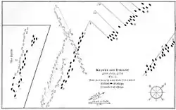 В свою очередь д’Орвилье, видя беспорядок, в который после всех манёвров пришли британцы, решил использовать момент. Его флот шел довольно стройной колонной, и в 1 час пополудни он скомандовал поворот последовательно, с намерением пройти британцев с подветра.[9] При этом французы могли ввести в бой все пушки наветренного, то есть высокого борта. На другом борту нижние порты приходилось держать закрытыми. Но головной корабль не увидел сигнала, и только де Шартр, четвёртый от начала, отрепетовал и начал поворот (2., поз. F).[21][11] Проходя мимо флагмана он голосом уточнил его намерение. Но из-за ошибки головного корабля удобный момент был упущен.[19]