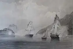 Оригинальный текст (англ.)Hearing the firing I took a small fast pulling [rowing] gig and went round a point of land with my long spy glass to see the fun, while many ships sent their armed boats, & the frigate got underway to protect them, it was quite a farce - I kept a mile off not intending to mix up in this quarrel.— [25]