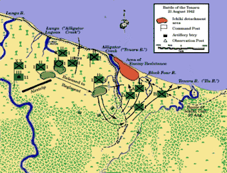 Полковник Клифтон Б. Гейтс, командир 1-го полка морской пехоты, разместил свои 1-й и 2-й батальоны вдоль западного берега бухты Аллигатор[25][26] Для укрепления обороны на косе бухты Аллигатор Гейтс направил 100 человек из 1-го батальона специального вооружения с 37 мм противотанковыми пушками с картечью.[27] Дивизионная артиллерия морской пехоты, в которую входили 75 мм и 105 мм гаубицы, была нацелена на восточную сторону и косу бухты Аллигатор, а артиллерийские наблюдатели расположились на передовых позициях морской пехоты.[28] Морские пехотинцы работали весь день 20 августа, подготавливая оборону, завершив большую часть работ к сумеркам.[25]