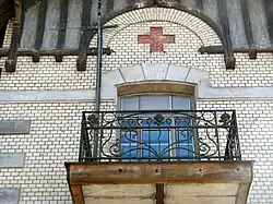В здании больницы есть одноэтажная и двухэтажная части, они сочленены асимметрично. Все фасады различны[4]. На стыке объёмов здания врезана круглая лестничная башня, конический шатёр которой внизу переходит в широкий навес, под которым устроен закрытый ярус, обшитый имитирующими фахверк досками. Спиральная лестница освещается окошками-«бойницами»[5]. У двухэтажной части здания различные щипцовые завершения: южное — треугольное с двускатной кровлей, северное — трапециевидное, полувальмовое, украшенное красным крестом[6]. Оба щипца декорированы конструктивно связанными со скатами крыш деревянными конструкциями, ажурной аркой из гнутых брусьев и решёткой с небольшой аркой. Свесы кровли поддерживают кронштейны[7].