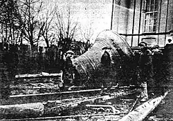 - 1 июня 2009 года освящённые ранее купола и кресты были подняты на церковную колокольню; главный — на высоту 65 метров. Малый крест установлен на отметке 13 метров, оставшиеся четыре — на 25-метровой высоте. Для выполнения этих работ потребовалась специальная техника — кран грузоподъёмностью 200 тонн[10].