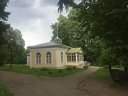 В середине XIX века на территории усадьбы был установлен обелиск Петру Великому (арх. Кампиони), построены триумфальная арка у въезда в парк, ротонда (павильон для танцев) и «Белый дворец» для приема почетных гостей, среди которых были члены императорской семьи. Возле верхней площадки лестницы, ведущей от подножия холма, стоит памятник юному Петру I (скульптор А. Д. Казачок), его открытие состоялось в дня всероссийского празднования 300-летия «Потешной флотилии» в 1992 году.[7]