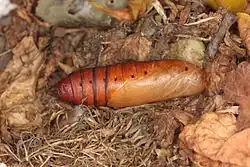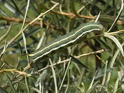 Гусеница к концу своего развития достигает длины 75—80 мм. Она светло-серого цвета с светлых пупырчатыми точках и белой продольной полосой на каждом боку. Рог на последнем сегменте тела длинный и тонкий, сверху — чёрного цвета, снизу — оранжевый, с двумя оранжевыми пятнами в основании[3]. Гусеницы питаются на лохе, облепихе. По окраске гусеницы практически неотличимы от листьев лоха серебристого. Окукливаются в почве. Зимует куколка.