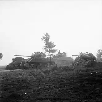 Танки «Шерман» проходят мимо сошедших с дороги британских танков, 17 сентября 1944 года. 30-й армейский корпус генерала Хоррокса мог двигаться только по единственной узкой дороге, что сделало всю технику корпуса уязвимой для немецких частей