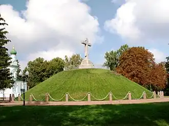 Воздвигнут 28 июня 1709 года по приказанию Петра I над братской могилой русских воинов, павших в Полтавском бою. Курган увенчан каменным крестом-памятником из серого гранита, установленным в 1894—1895 годах, на восточной стороне креста надпись: «Погребены бригадир Феленгейм, полковники Нечаев и Лов, подполковник Козлов, майоры Кропотов, Эрнст и Гельд, обер-офицеров 45, капралов и рядовых 1293, всего погребено 1345 человек». На западной стороне креста — слова из речи Петра I перед битвой: «Воины! Вот пришел час, который решит судьбу Отечества. И так не должны вы помышлять, что сражаетесь за Петра, но за государство, Петру врученное, за род свой, за отечество, за православную нашу веру и церковь. Имейте в сражении пред очами вашими правду и Бога, поборающего по вас; на Того Единого, на кого всесильного в битве уповаете. А о Петре ведайте, что ему жизнь его не дорога, только бы жила Россия в блаженстве и славе, для благосостояния вашего».
