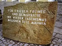 Мемориальный камень против войны и фашизма перед домом, где родился Адольф Гитлер.