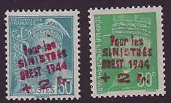 - «R F Pour les SINISTRES BREST 1944 + 2 Fr» («Французская Республика для убытков Бреста 1944 +2 франка»),