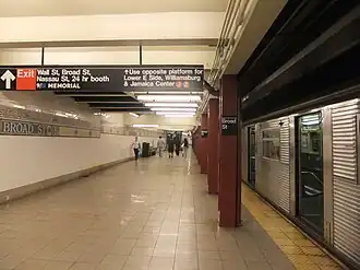 Станция имеет три выхода. Постоянно открыт только один выход. Он находится с северного конца станции и представлен лестницами имезонином, расположенным над платформами. Каждую платформу и мезонин соединяет одна лестница. В самом мезонине располагается турникетный павильон. В город из мезонина поднимаются две лестницы — к южным углам перекрестка Брод и Уолл-стрит. Существует также и третья лестница, которая приводила ко входу Нью-Йоркской фондовой биржи. Она была закрыта в связи с ужесточением мер безопаснности, принятых после терактов 11 сентября.