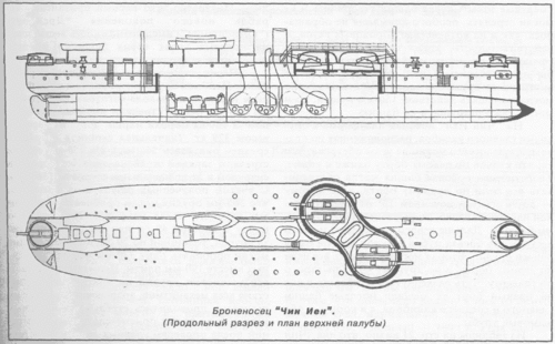 - ↑ Белов А. А. Броненосцы Японии. «Чин-Иен» Архивная копия от 1 июня 2012 на Wayback Machine