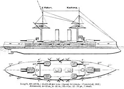 От своего прототипа, британского броненосца «Кинг Эдуард VII», он отличался следующими деталями. 254-мм пушки были установлены на место 9,2". Кроме того, что он стал первым в японском флоте шестибашенным кораблем, в башнях которого располагались только крупнокалиберные орудия. Сильное артиллерийское вооружение дополняли и два 152-мм орудия верхнего каземата в средней части корабля, который был, в отличие от «Кинг Эдуард VII», двухъярусным[1].