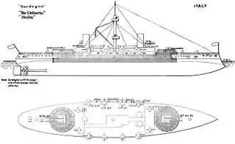- ↑ Все предшествующие итальянские броненосцы имели диагональное расположение орудий главного калибра, при котором приоритет отдавался погонному и ретирадному огню в ущерб бортовому.