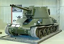 Схожим образом сложилась и судьба противотанковых САУ, получивших обозначение Pvkv m/43. В качестве шасси был избран средний танк m/42, однако специально для САУ было решено разработать новую механическую трансмиссию. Лобовое бронирование Pvkv m/43 достигло 80 мм, а вооружение САУ составил противотанковый вариант 75-мм зенитной пушки m/36 с длиной стола в 50,5 калибров; для размещения более мощной артиллерийской системы на месте подбашенной коробки танка была установлена открытая сверху неподвижная рубка, ограничившая углы горизонтального наведения до ±15°. В 1942 году «Ландсверк» был выдан заказ на выпуск 87 САУ, первые из которых должны были быть переданы армии в 1944 году, однако различные проблемы, прежде всего задержки с разработкой механической трансмиссии, привели к тому, что к 1944 году был завершён только прототип Pvkv m/43, а выпуск серийных машин начался лишь в 1946 году[44][106][107].