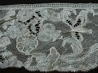 Брюссельское кружево частично кружево . Оно сделано по частям, с цветами и узором, отделенными от основы, в отличие от кружева малин или валансьенских кружев; из-за этого длинные нити, образующие узор, всегда следуют изгибам узора, тогда как в коклюшечных шнурках, сделанных сразу, нити параллельны длине шнурка.[6]