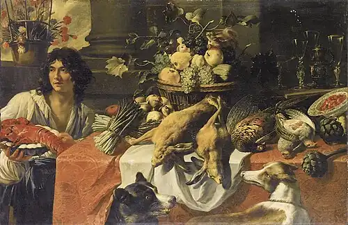 Натюрморт с битой дичью, фруктами, артишоками, спаржей, юношей, кладущим на блюдо омара, и двумя собаками