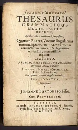 - Joannis Buxtorfii Lexicon hebraicum et chaldaicum : complectens voces omnimodas quae in Sacris Bibliis exstant exemplorum biblicorum copia et locorum difficilium explicatione ex hebraeorum commentariis desumpta auctum atque illustratum. Accesserunt lexicon breve rabbinico-philosophicum et index latinus. Romae : Typis Joannis Ferretti, 1845.