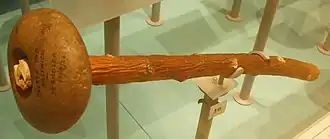 - Некоторые каменные навершия булав и топоров имеют отверстие слишком малого диаметра, по причине чего способ крепления их к рукояти не ясен. Существует версия, что эти навершия надевались на ветви дерева. По мере роста дерева диаметр ветвей увеличивался, и в результате навершия прочно фиксировались на них. После этого можно было обрубать ветви и использовать орудия по назначению.[16] Также высказывалась версия, что навершие надевалось на деревянную рукоять, предварительно обмотанную влажной кожей[17].