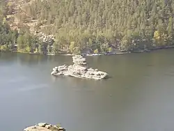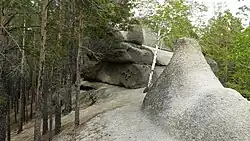 Расположен на Кокшетауской возвышенности на высоте около 480 метров, в сосновом бору, на перешейке, разделяющем озёра Бурабай и Большое Чебачье.