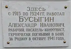 - У входа на Ростовский паровозоремонтный завод была установлена мемориальная доска: «Здесь с 1915 по 1924 г. работал Бусыгин Александр Иванович, рабочий, писатель-коммунист, героически погибший в боях за Родину в октябре 1941 г.»