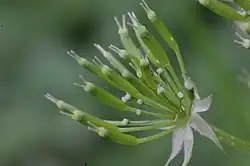 Вислоплодники 7–8 мм длиной, 0,7–1 мм шириной, продолговатые, уплощённые, голые, мерикарпии со спинной стороны со слабо выраженными рёбрами. Столбики расходящиеся, подстолбия конические.