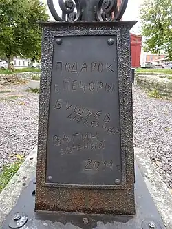 — Идея памятника возникла давно, — рассказал Александр Бушуев. — Вопрос о месте его установки даже не стоял. Печоры — особенный и дорогой сердцу город. Сам памятник получился даже больше, чем задумывалось изначально. За это спасибо ребятам из Псковского кузнечного двора, которые его совершенно бесплатно создали. А вообще, этот памятник возвращает нас в те времена, когда мы были маленькие, деревья большие, люди добрые, а зарплаты у всех одинаковые.[6]
