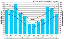 Буэнос-Айрес — город южного полушария, расположенный на 34° 36' южной широты и 58° 26' западной долготы, в южной части материка Южная Америка, на расстоянии 275 км от Атлантического океана в бухте залива Ла-Плата, на левом берегу реки Риачуэло[68]. В 220 км от города на другом берегу залива Ла-Плата расположена столица Уругвая — Монтевидео.