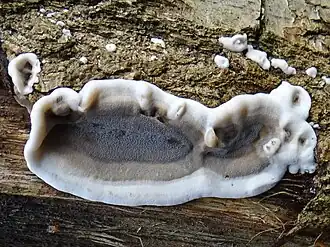 Плодовые тела однолетние, лишённые ножки, часто почти распростёртые, с небольшой приподнятой над субстратом частью, однако почти никогда не полностью распростёртые, мягкие, гибкие и тонкие, 1—4×2—7 см. Верхняя поверхность отогнутой шляпки войлочно-волокнистая, затем нередко голая или шершавая, обычно мелкоморщинистая, от беловатой до желтовато-сероватой и буроватой. Край шляпки обычно более тёмный, острый, часто немного изогнутый.