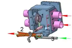 Одним из первых для заполнения центробежных насосов пожарных автомобилей, использовали струйный вакуумный аппарат «газоструй». Применение данного устройства было обусловлено простотой конструкции и изготовления. Газоструй монтировался в систему выпуска выхлопных газов пожарного автомобиля перед глушителем. Для создания вакуума необходимо было перекрыть заслонкой 1 (на илл.) отверстие подсоединения глушителя автомобиля и направить выхлопные газы в диффузор 2. К диффузору подсоединялась вакуумная трубка 3 пожарного насоса. Двигатель пожарного автомобиля разгонялся, скорость выхлопных газов увеличивалась, и в трубке связанной с пожарным насосом создавался вакуум. Работа газоструя продолжалась до заполнения пожарного насоса водой. Для контроля заполнения водой насоса в вакуумном кране предусмотрен глазок. При появлении воды в глазке оператор перекрывал вакуумный кран, выключал газоструй и включал пожарный насос. В некоторых моделях пожарных автомобилей в газоструй монтировался резонатор звуковой сирены, с помощью которого, подавался звуковой сигнал. Данная схема создания вакуума существовала достаточно долго и сейчас существует на старых пожарных автомобилях. В дальнейшем стали использоваться шиберные и поршневые вакуумные аппараты. Также были попытки использовать диафрагменные и водокольцевые вакуумные аппараты, однако широкого применения в пожарной технике данные типы аппаратов не получили.