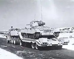 Перевозка на тяжёлых трейлерах, подобных этому, была эффективным средством быстрой доставки медлительного «Валентайна» к району боевых действий