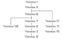 Первый серийный «Валентайн» сошёл с конвейера фирмы «Виккерс» в мае 1940 года, а в июле того же года к производству подключились фирмы «Metro Cammell» и «Birmingham Railway Carriage & Wagon Co.». Общий объём выпуска первой модификации «Валентайна», Valentine Mk I, оснащённой бензиновым двигателем AEC A189, составил, по разным данным, от 309 до 350 единиц[7][8]. Вскоре было развёрнуто производство ещё двух версий. Valentine Mk II отличался от первоначальной модификации дизельным двигателем AEC A190, уменьшенным объёмом внутреннего топливного бака и дополнительным внешним баком, новой радиостанцией № 19, а также рядом более мелких отличий. Valentine Mk IV был в целом идентичен Mk II, но отличался установкой импортного американского дизельного двигателя GMC 6-71 6004 и иной трансмиссии. Всего было произведено, по разным данным, от 700 до 1590 Mk II[7][8] и 660 Mk IV[7].