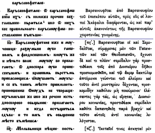 Варсануфи́ты (др.-греч. βαρσανουφῖται; лат. barsanuphitae; ст.‑слав. варъсанофитѧнє, варъсанѹфитанє) или семидали́ты (др.-греч. σεμιδαλῖται от др.-греч. σεμίδᾱλις — «семидал или мука тончайшего помола»; лат. semidalitae; ст.‑слав. мѹчєници) — еретики, описанные Тимофеем Константинопольским в книге «Τιμοθέου πρεσβυτέρου τῆς άγιωτάτης μεγάλης ἐκκλησίας Κωνσταντινουπόλεως, πρός Ιωάννην πρεσβύτερον τῆς άγιωτάτης τοῦ θεοῦ καθολικῆς ἐκκλησίας, καί σκευοφύλακα τῆς ἀγίας Θεοτόκα τῆς ἐν τοῖς Χαλκοπρατείοις περί διαφοράς τῶν προσερχόμενων τῆ εὐαγεστάτη ημών πίστει» и Иоанном Дамаскиным в книге «О ста ересях вкратце», у последнего это 86 ересь. Тимофей Константинопольский сообщает о том, что варсануфиты получили своё название по имени епископа Варсанофия, который был основателем этой ереси, и который был поставлен антиканонично. Иоанн Дамаскин сообщает, что вероучение варсануфитов совпадало с учением гайянитов и феодосиан, имеется в виду, что варсануфиты исповедовали нехалкидонское миафизитское вероучение. Отличительной особенностью варсануфитов, из-за которого они получили второе название «семидалиты», и о которой сообщает Иоанн Дамаскин, было следующее: варсануфиты не совершали божественной евхаристии. Они хранили дары, принесённым Диоскором. К этим дарам они приносили пшеничную муку тончайшего помола — семидал[1][2], смешивали семидал с дарами, после чего каждый пальцем касался семидала, а затем причащался семидалом, которой прилипал к кончику пальца. Этот семидал и был святыми дарами для варсануфитов. Тимофей Константинопольский причисляет варсануфитов к третьей категории еретиков, принимаемых в Церковь через письменное проклятие ими ереси.
