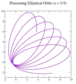 Она близка по значению к величине прецессии для Меркурия, необъяснённой ньютоновской теорией гравитации[30]. Это выражение используется для оценки прецессии, связанной с поправками общей теории относительности для двойных пульсаров[31]. Это согласие с экспериментом является сильным аргументом в пользу общей теории относительности[32][33].