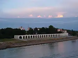 Особенностью Новгорода является то, что он всегда был и остаётся разделён на две части — Торговую и Софийскую стороны, границей между которыми является река Волхов. В прошлом это деление носило не только географический характер, но отражалось и на внутренней истории города. Соперничество жителей Торговой и Софийской сторон нередко приводило к открытым столкновениям на Великом мосту через реку. Средневековый город сложился на месте более ранних селений у истока Волхова из Ильменя, где сгусток стоянок и поселений прослеживается со времён неолита (4—3 тысячелетия до н. э.)[31][32][33]. Обзор досредневековых реалий Новгородской земли подробно даётся в ряде материалов[34].