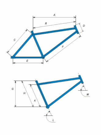 - Эффективная длина верхней трубы. Расстояние между центрами рулевой колонки и подседельного штыря (на рисунке — A). Длинная верхняя труба даёт большую «стабильность» и меньшую манёвренность велосипеда.