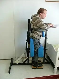- Передний вертикализатор — вертикализатор, находясь в котором пациент опирается на живот. Большинство вертикализаторов относятся к переднему типу.